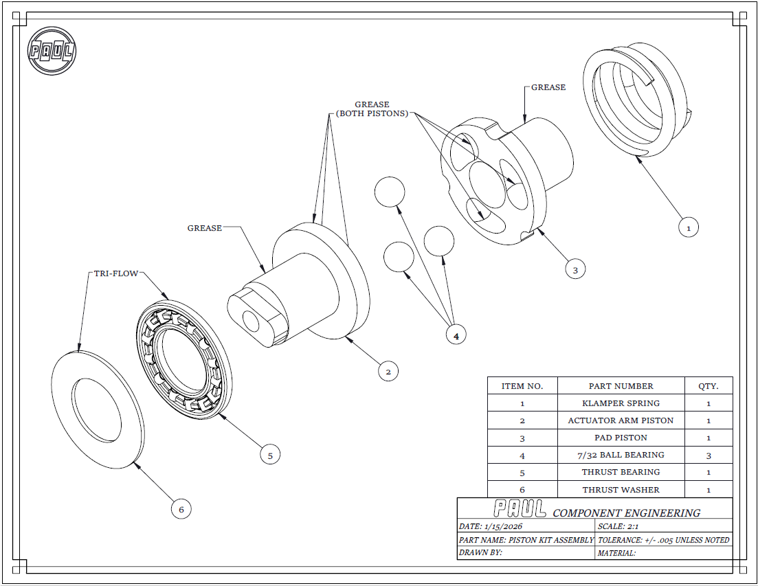 Everything you need to refresh the “guts” of one Klamper disk brake. Inner and outer CNC machined heat treated pistons, new ramp bearings, new thrust bearing and washer, and a fresh spring are included.